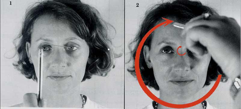 2. The pen should be held at a 45 degree angle as the patient progresses in doing successive concentrique circles in front of their forehead. They must slowly approach the tip of the pen as they diminish the diametre of the cirlcles. If the target is lost or "doubled" the exercises are stopped and must be redone.