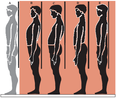 However, the following figure illustrates several types of postures that can be symptomatic. It is important to note that these types of postures (excluding A) will either increase or decrease the lumbard and cervical arrows resulting in the compromising of inter-vertebral joint as well as compressions, distractions, rotations and torsions at the articular, capsular, ligament, muscular and tendon level, etc.